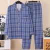 New Men's Plaid Home Service Suit 100% Cotton Crepe Cloth Pajamas Long-sleeved Trousers Simple Two-color Plus Size Home Service