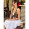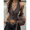 Yousheng Sexy Vest Halter Lace-up Sleeveless Backless Plaid Pattern Tops with Lace Decoration Slim Fit French Style Tops