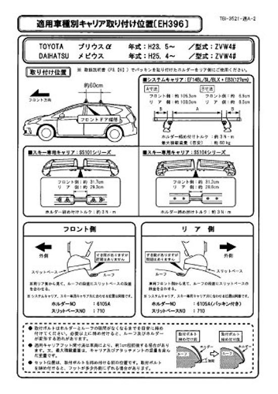 Terzo Roof Carrier Set of for Toyota Prius Alpha EH396 (by PIAA) Carrier/Base Holder, 4, Black, ZVW4#,