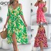 QICED Spring Summer Casual V-neck Button Bat Sleeve Flower-patterned Dress for Women