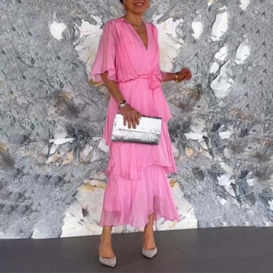 Dámské splývavé šifonové šaty pro svatebního hosta s volánky, polovičními rukávy, empírovým pasem, řasené, zavinovací šaty, V výstřih, vrstvené swingové šaty