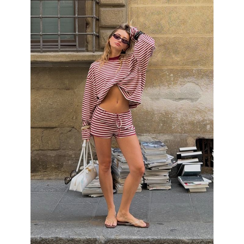 Classic Stripes American Sexy Japanese Magazine Wind Sloth Loose Contrast Color round Neck Long Sleeves T-shirt Slimming Shorts Two-piece Set