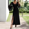 Women's V Neck Maxi Dress Sexy Mesh Long Lantern Sleeve Slit
