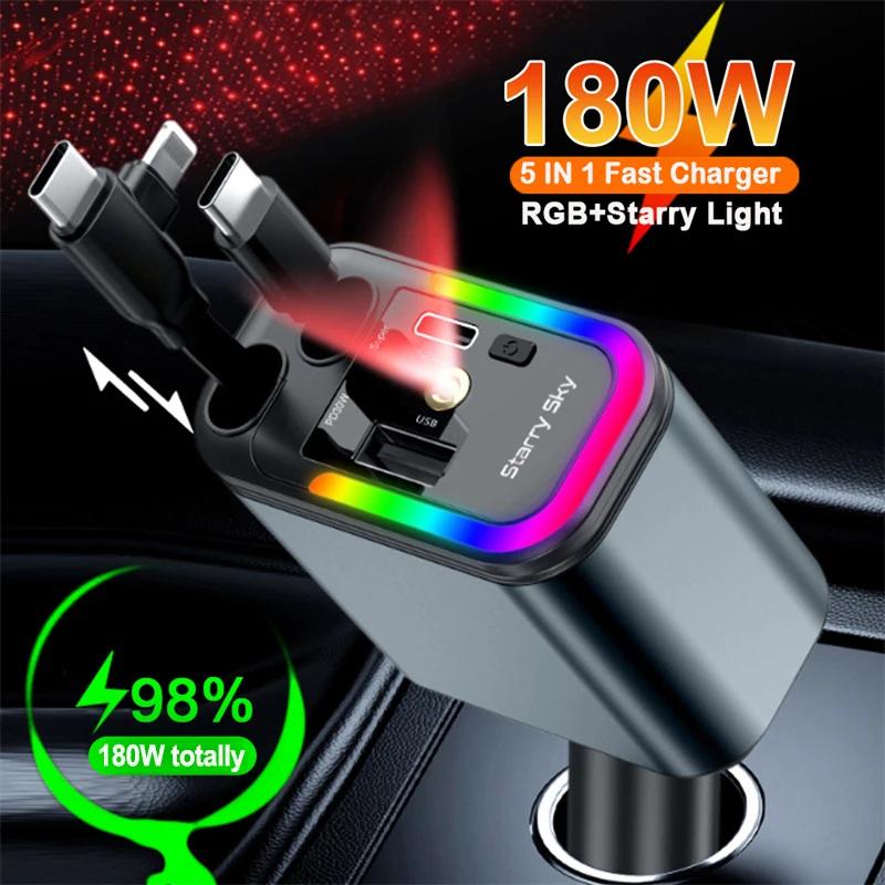180W 5 In 1 Retractable Car Phone Charger RGB Starry Sky Light for PD/QC3.0/SCP/VOOC/FlashCharge/AFC/FlashCharge Protocols Phone