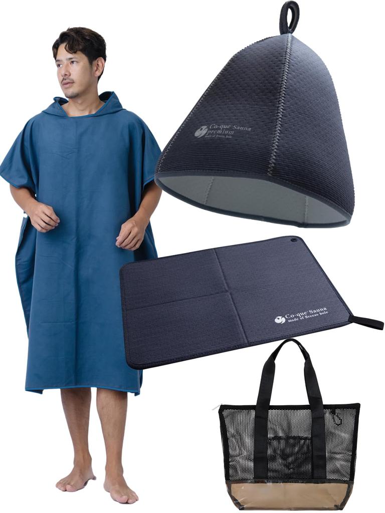 Sauna Preparation Set Sauna Sauna Sauna Poncho and Mesh Bag [co-que] (4 pieces) Hat, Mat, Lite, (Poncho Blue, Hat Gray, Mat Gray)